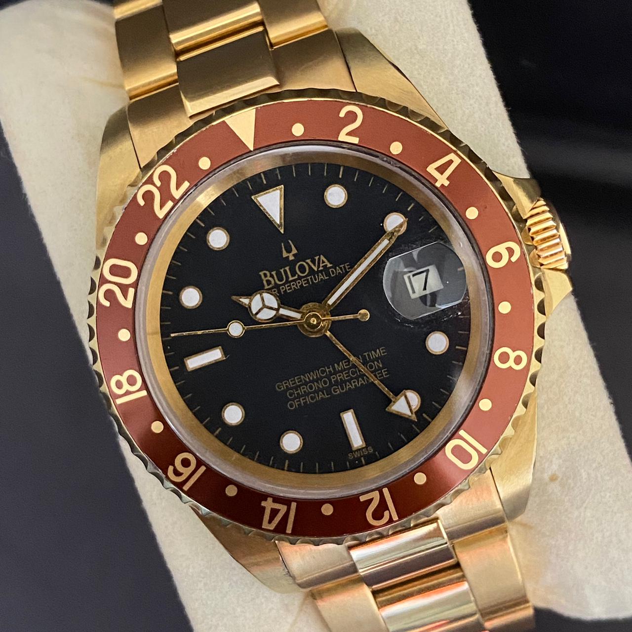 RARE Bulova Perpetual Date GMT Rootbeer Dial Automatic Gold 1990's Vintage Watch
