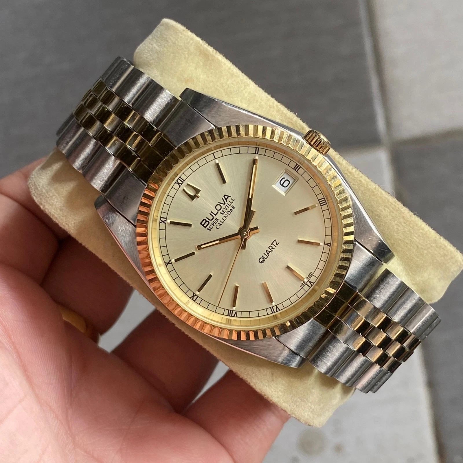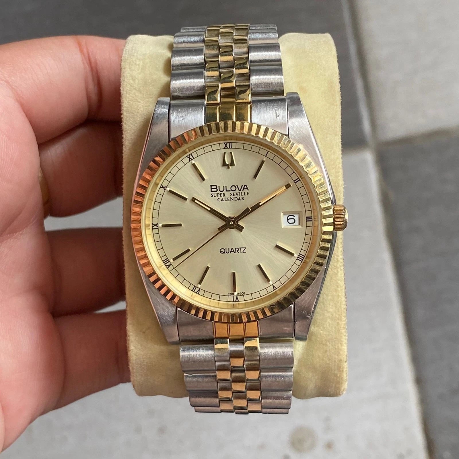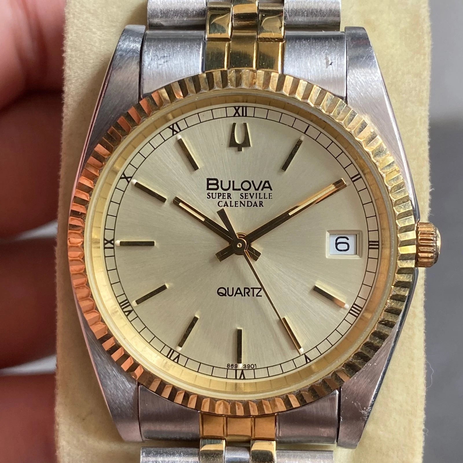 Rare Bulova Super Seville Calender Quartz Two Tone Gold Dial Vintage Watch Men