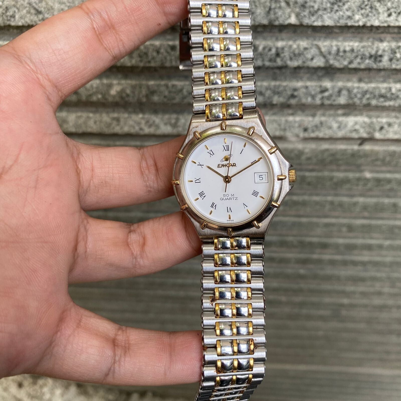 RARE Enicar 50M 955.051 Quartz Swiss Two Tone White Dial Vintage Watch
