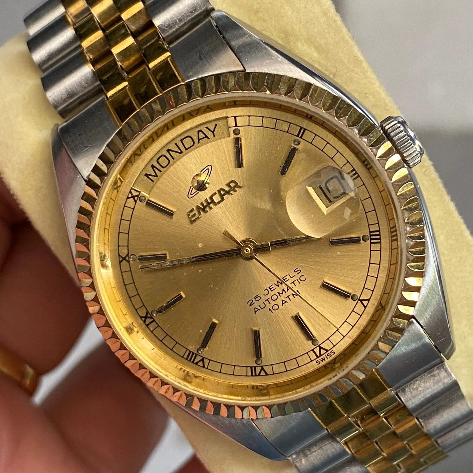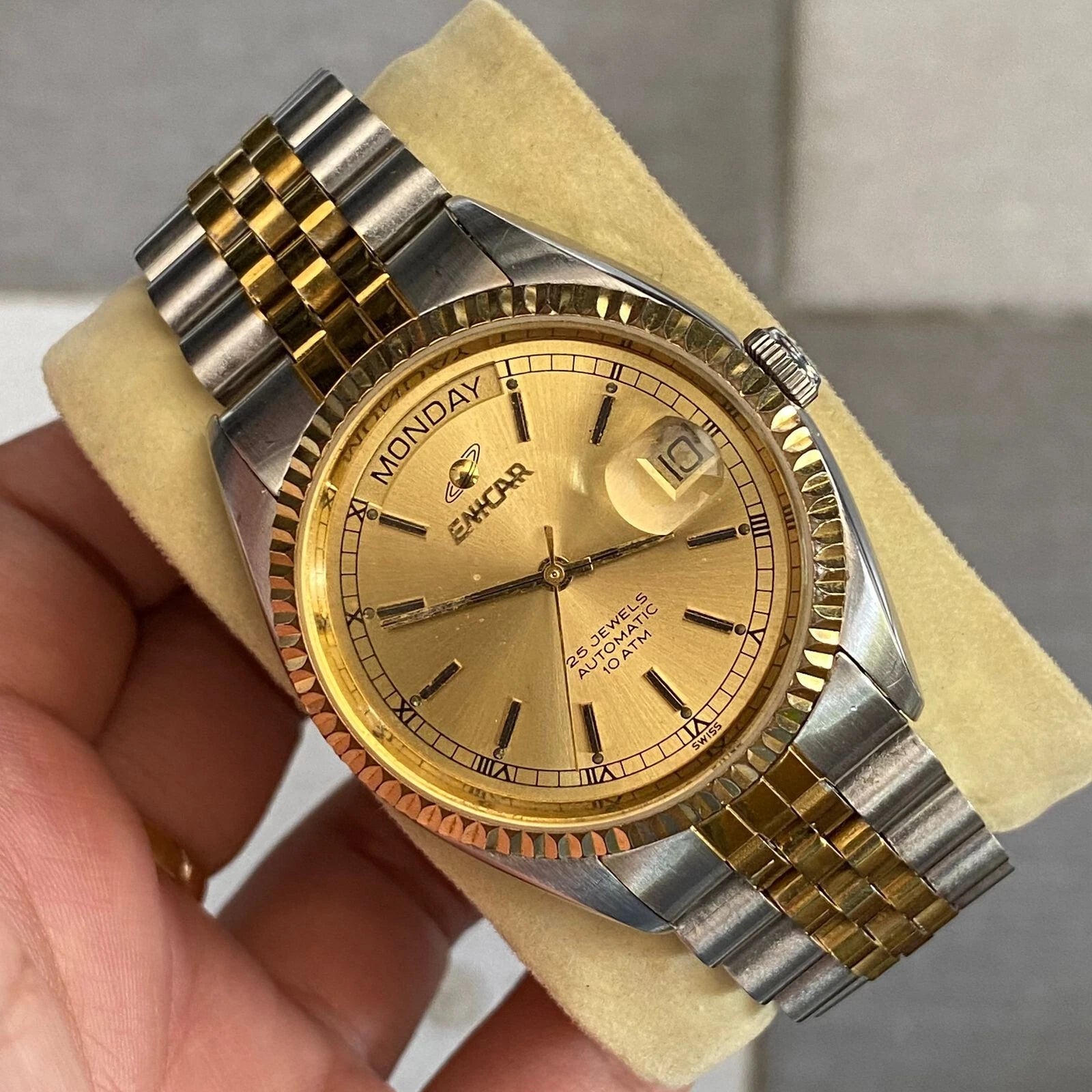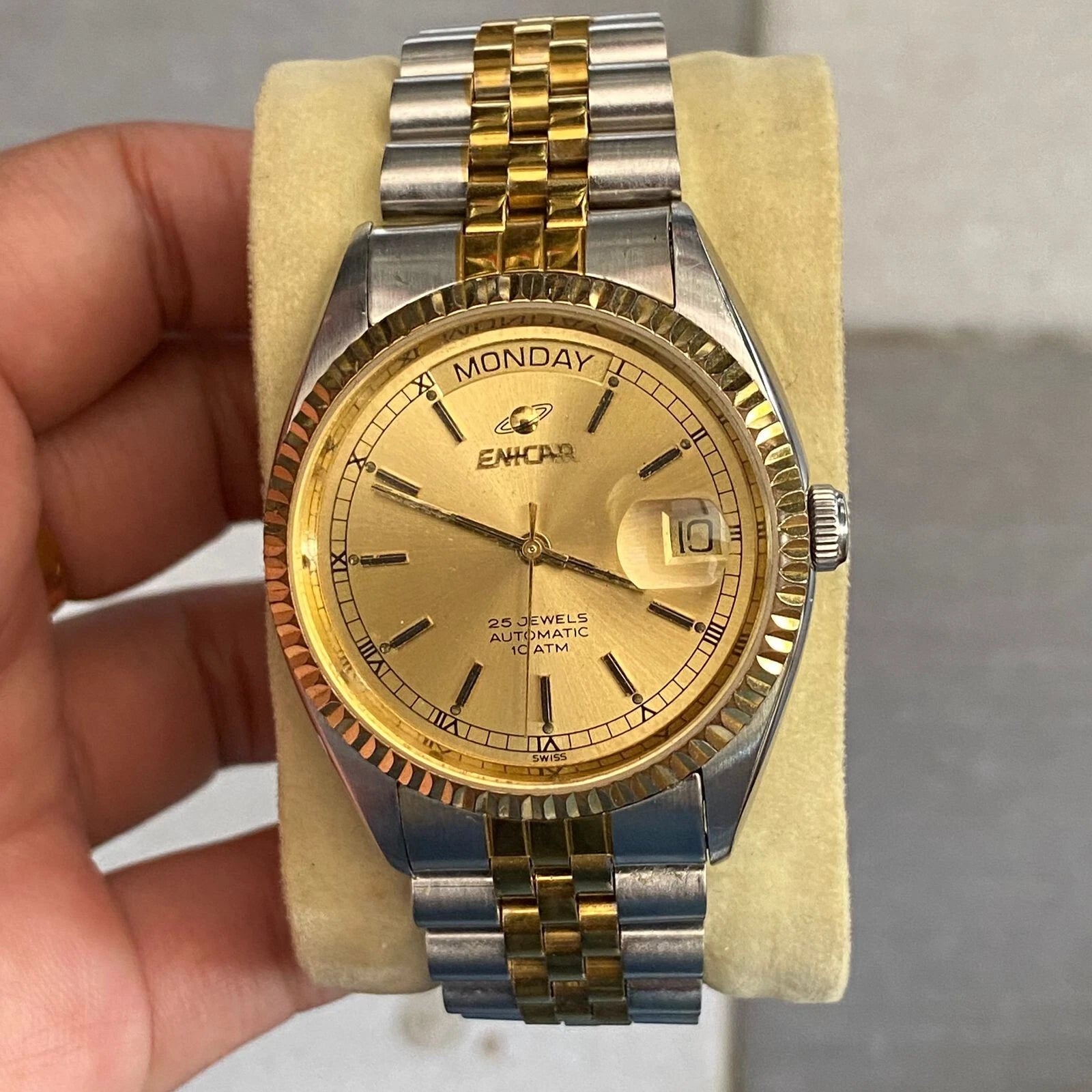Rare Enicar President Automatic 25 jewes Gold Dial Two Tone Baton Vintage Watch