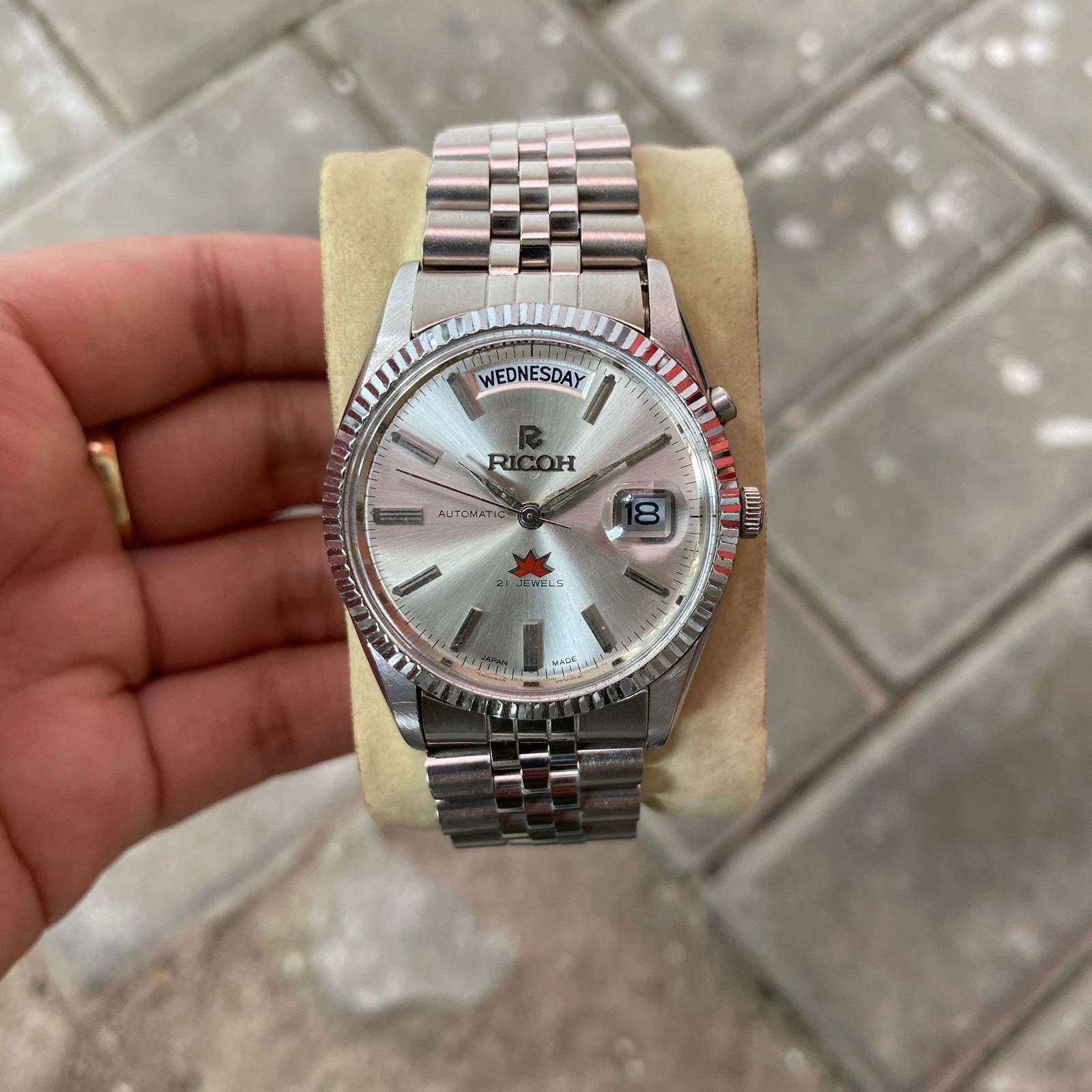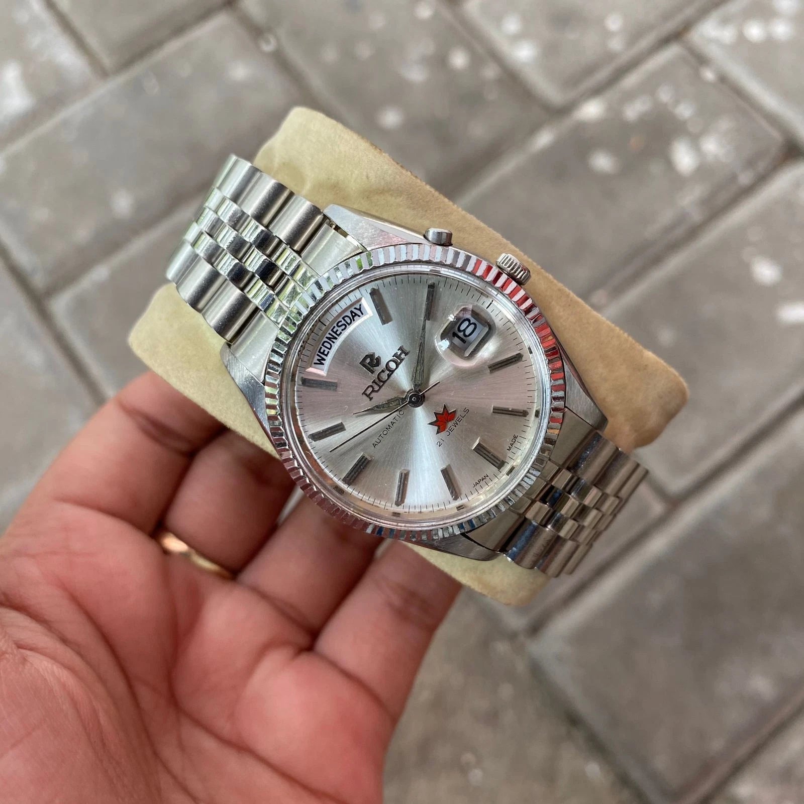 Rare Ricoh President Automatic Silver Dial Day Date Maple Leaf Vintage Watch Men