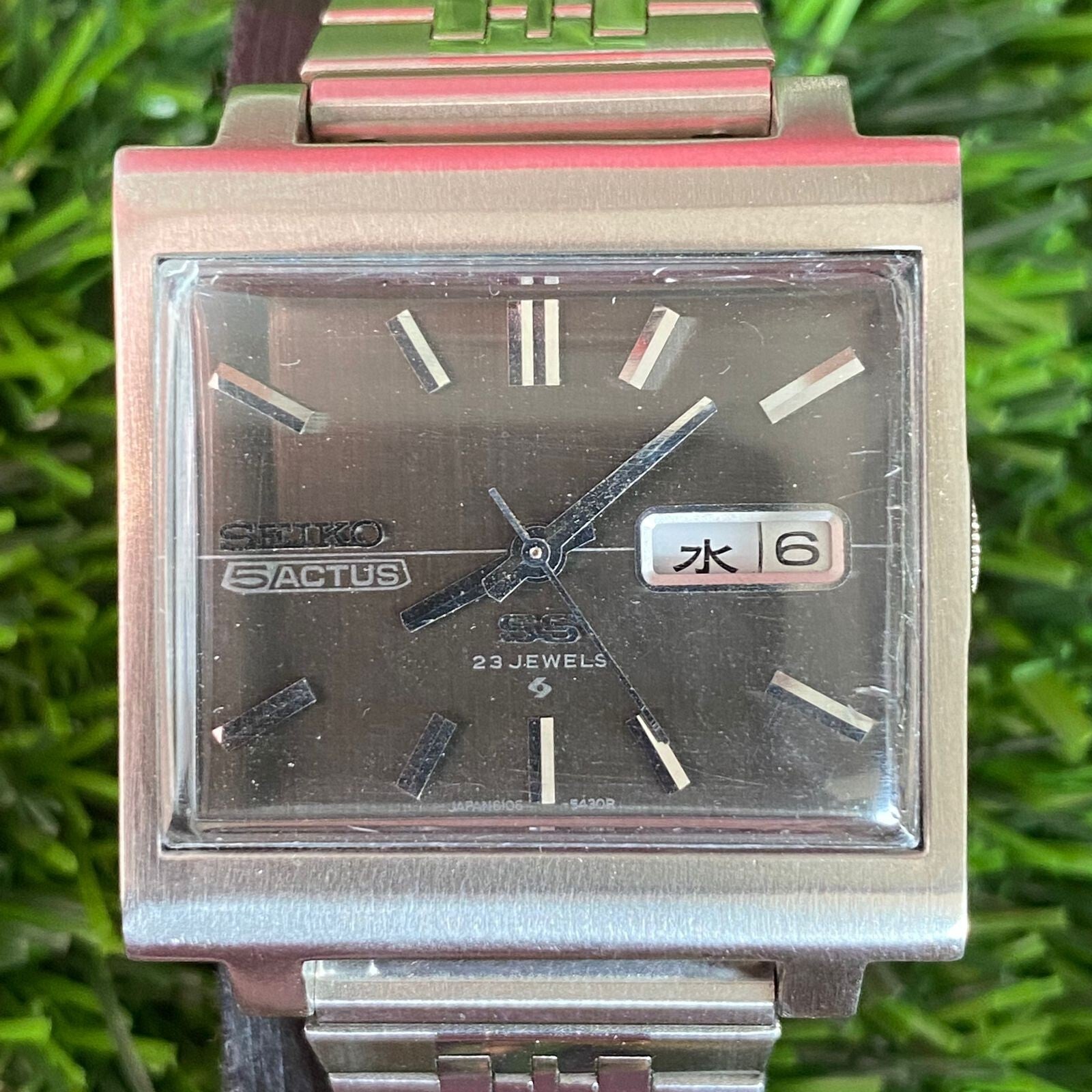 Rare Seiko 5 Actus SS Square Day Date Automatic 6106-5440 Gray Dial Watch Men JR