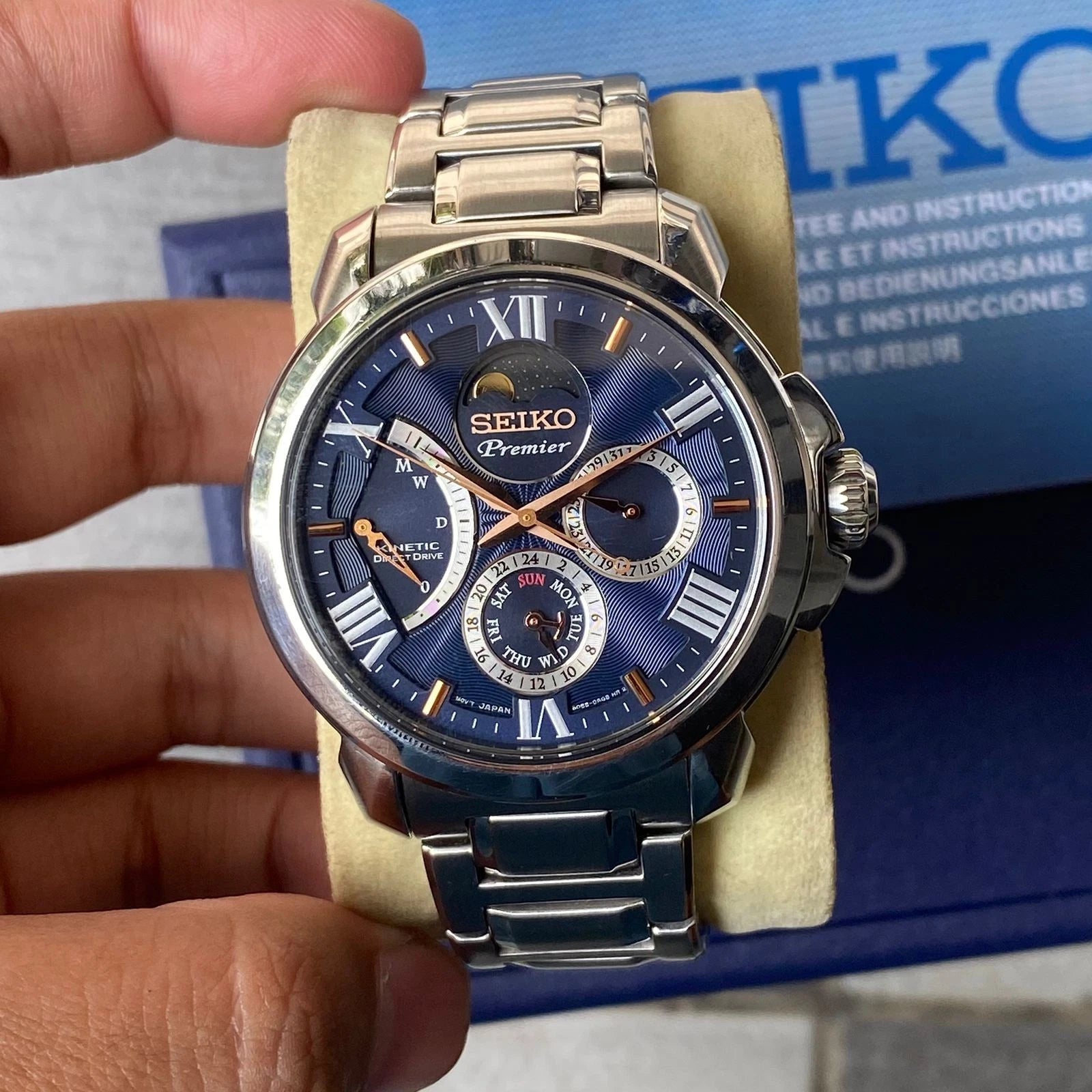 Rare Seiko Premier SRX017P1 Kinetic Direct Drive Moonphase Blue Dial Watch Men