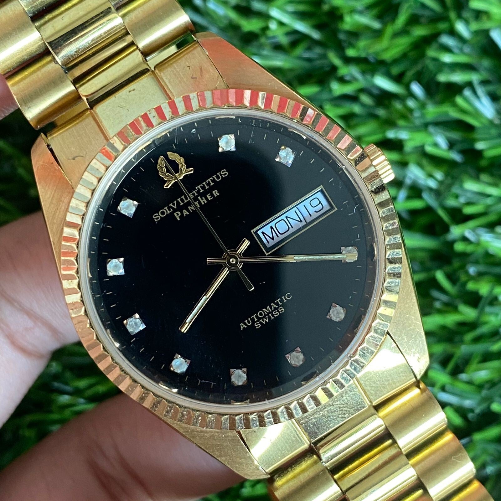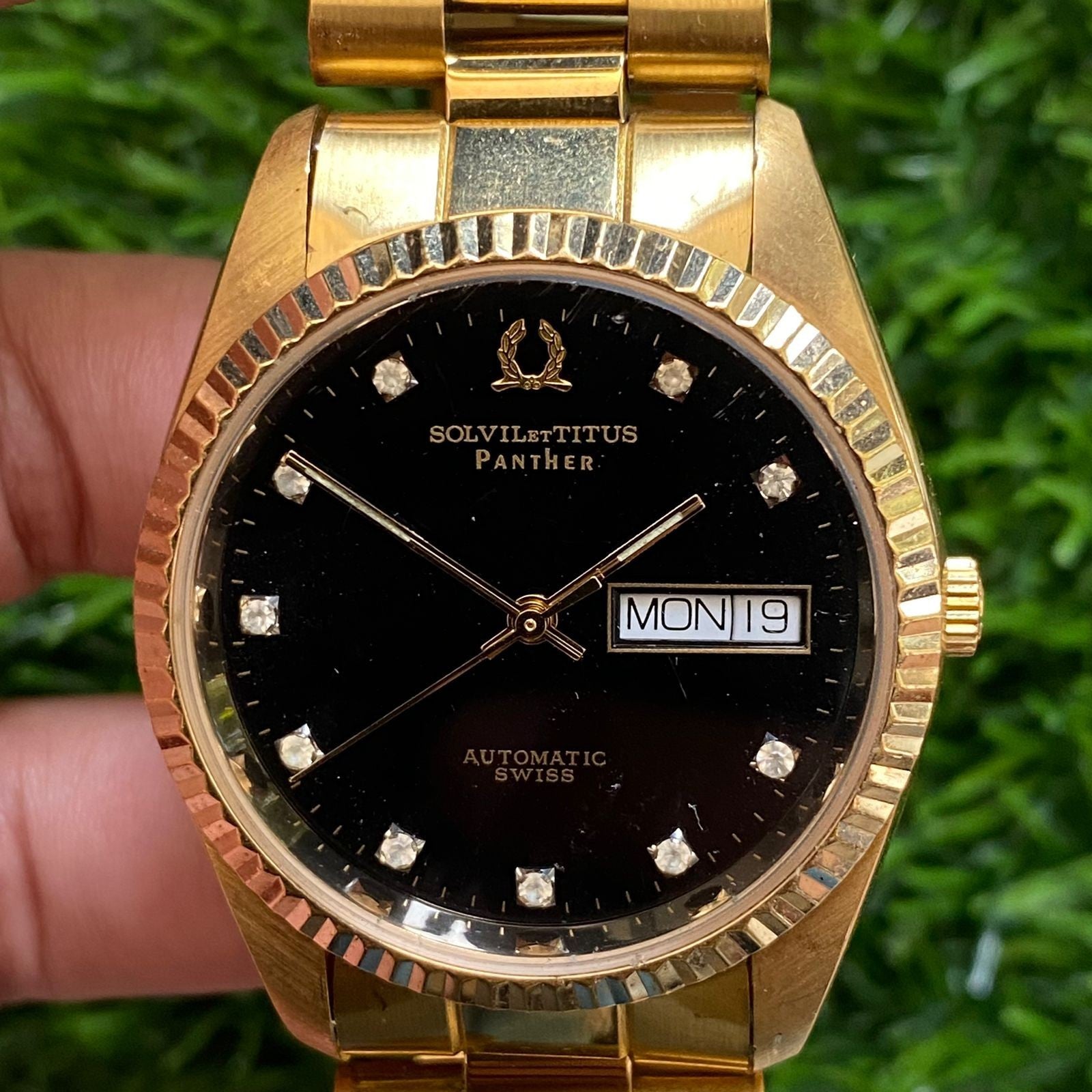 Rare Solvil et Titus Panther Automatic Day Date Index Diamond Black Dial Men